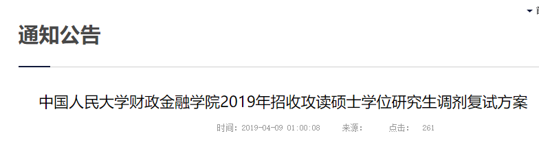根據(jù)《中國(guó)人民大學(xué)碩士研究生復(fù)試工作管理辦法》中關(guān)于調(diào)劑復(fù)試的相關(guān)規(guī)定,我院對(duì)2019年攻讀碩士學(xué)位研究生調(diào)劑復(fù)試相關(guān)事宜做如下安排: