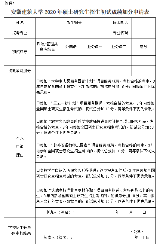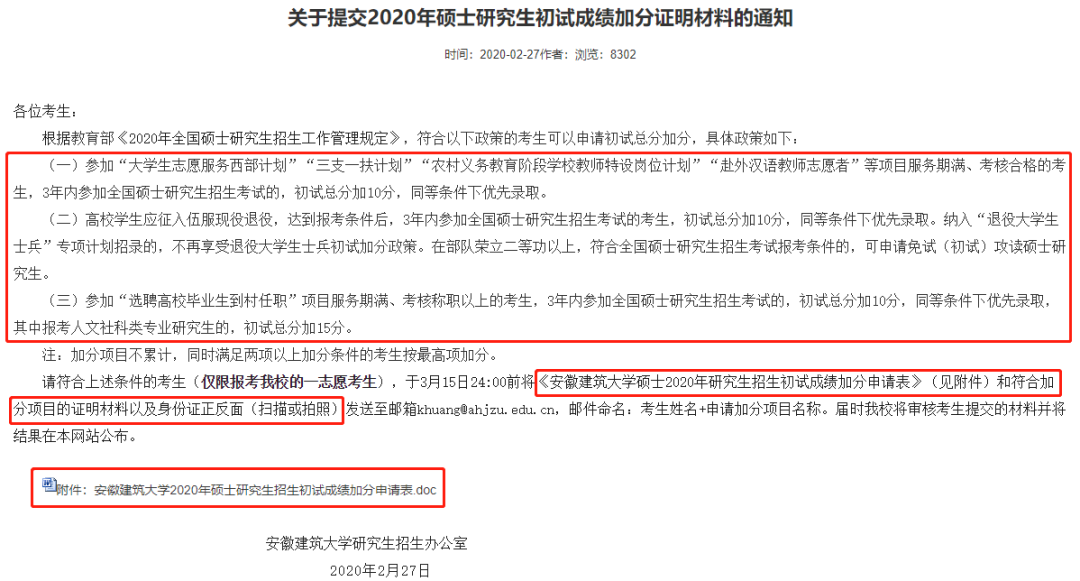 《通知》中指出:請符合上述條件的考生(僅限報考我校的一志愿考生),于3月15日24:00前將《安徽建筑大學(xué)碩士2020年研究生招生初試成績加分申請表》(見附件)和符合加分項目的證明材料以及身份證正反面(掃描或拍照)發(fā)送至郵箱khuang@ahjzu.edu.cn,郵件命名:考生姓名+申請加分項目名稱。屆時我校將審核考生提交的材料并將結(jié)果在本網(wǎng)站公布。
