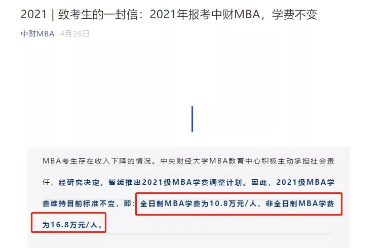 MBA學費保持在三年一漲的態勢,但是今年因為疫情原因,職場人士收入普遍下降,漲幅如何待定。報考中央財經大學的同學可以放心,4月26日央財通知:2021年報中財MBA,學費不變。