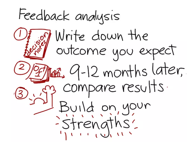 要發現自己的長處,唯一途徑就是回饋分析法(feedback analysis)。每當做出重要決定或采取重要行動時,你都可以事先記錄下自己對結果的預期。9到12個月后,再將實際結果與自己的預期比較。