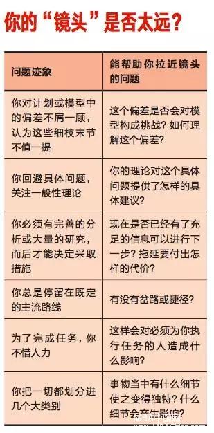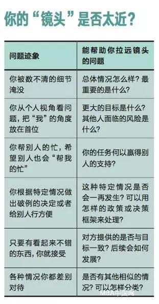 拉近鏡頭,會導致管理者無法看清全局,忽略重要的問題。在這種狀態下做出的決定只取決于你自己和你認識的人,而非更廣大的目標。近距離視角還會導致領地保護。如果管理者發言時開始透露出保護自己地盤的跡象,就是掉進了這個陷阱。