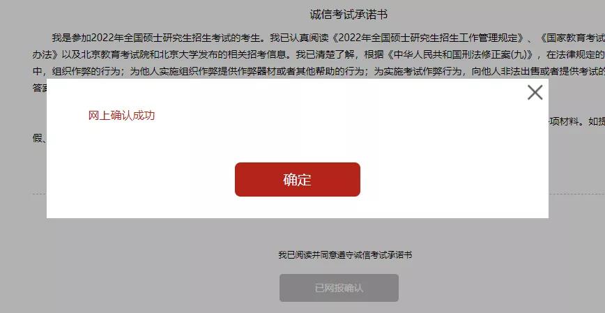 因北京大學報考點不設現場確認,所以需考生在在“北京大學研究生招生網”上確認本人報考信息。 ? 北大研招網確認信息:2020年11月2日10:00至11月5日16:00,逾期不補。 ? 打印準考證:2021年12月18日至2021年12月24日。 ? EMBA聯考筆試(北大本部):2021年12月25日8:30-11:30。 網上確認報考信息 第1步 登錄北京大學研究生招生網,點擊【碩士學位研究生】。 https://admission.pku.edu.cn/ 第2步 請認真閱讀“考試誠信承諾書”,點擊【我已閱讀并同意遵守信靠承諾書】,再點擊【網報確認】。 第3步 當頁面出現“網上確認成功”即可。 北京大學報考點(1101)采取網上確認報考信息的方式。2021年11月2日10:00至11月5日16:00,所有選擇北京大學報考點的考生,均須登錄北大研招網對本人網上報名信息進行認真核對并進行確認。報名信息經考生確認后一律不作修改,因考生填寫錯誤引起的一切后果由其自行承擔。 內容包括: ①網報信息真實準確; ②繳費狀況為“已交費”; ③上傳照片審核結果為“審核通過”; ④學歷(學籍)校驗審核結論為“校驗通過”。網上學歷(學籍)未通過校驗 的考生,須按照第四條學歷(學籍)校驗提供證明材料,方可進行網上確 認; ⑤北京戶籍或北京社保記錄“審核通過”。 以上各項內容均無誤者,點擊“確認信息”進行網上確認。逾期未點擊“確認信息”按鈕進行網上確認,則報名程序未完成,報名無效,不予準考,相關后果考生自行承擔。