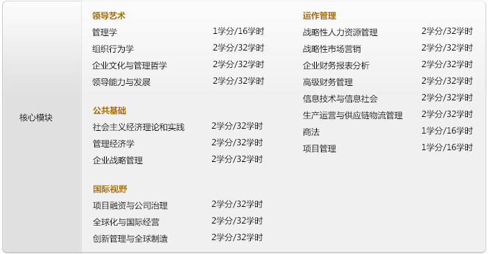 浙江大學EMBA的課程設置參照了AMBA國際權威管理教育質量認證體系的標準,采取分階段層次推進的模塊化教學模式,配置“課程模塊套餐”,使學員增強領導藝術,提升戰略思維,強化運作管理,開拓國際視野,提高綜合素養,創新商業問題解決方案。