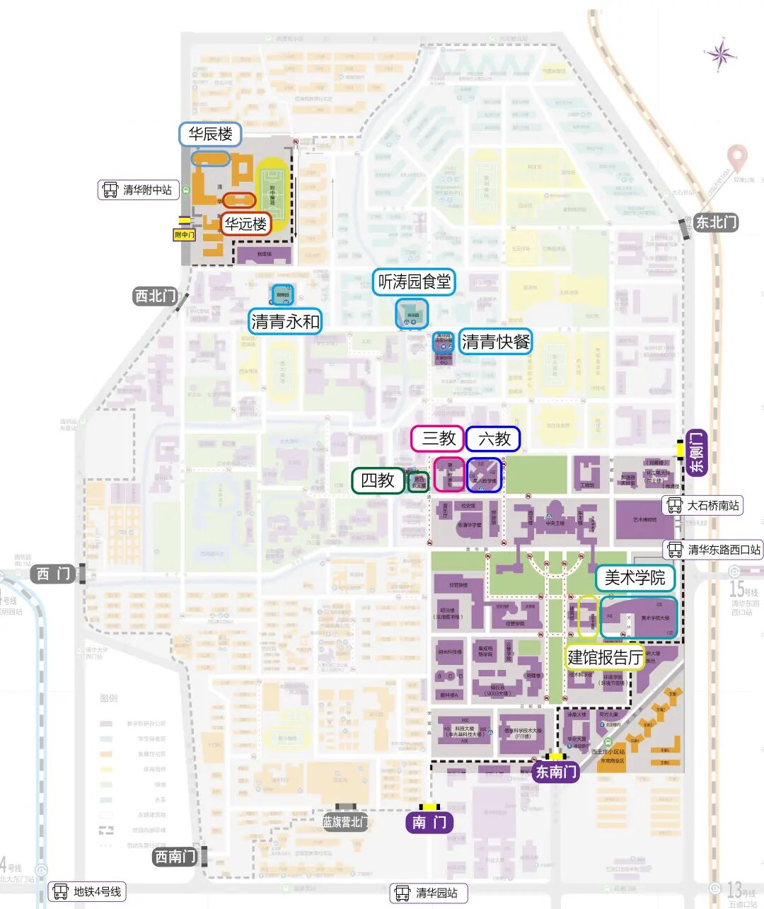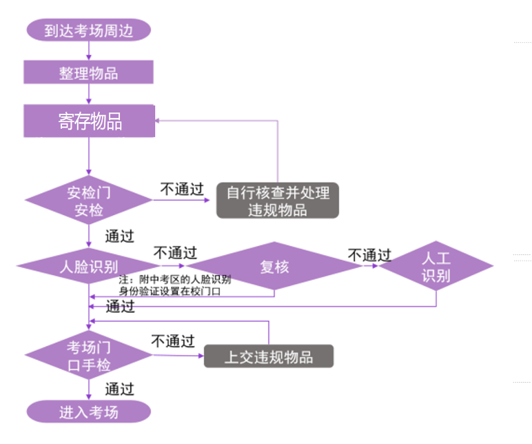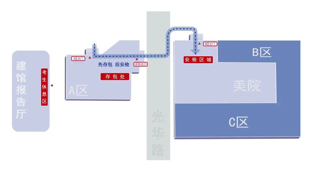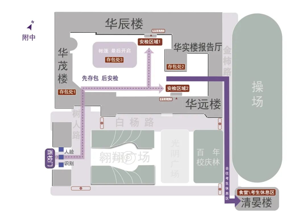 2026年全國碩士研究生招生考試 清華大學考點考生須知 清華經管EMBA2026級研究生統考筆試 將于2025年12月20日上午舉行 為確保考試過程平穩順利 清華大學考點現就 考前材料準備、入場安排、考場分布 就餐和休息等相關事宜 公告如下 01 考前材料準備 身份證:本人有效期內居民身份證原件。 準考證:憑網報用戶名和密碼登錄“中國研究生招生信息網” (https://yz.chsi.com.cn)下載打印,正反面不得涂改和書寫。 符合規定的考試用品:比如2B鉛筆、黑色字跡的鋼筆或簽字筆、直尺、圓規、三角板、無封套橡皮等必需的考試用品,或者按照招生單位在準考證上注明的所需攜帶的用具。 A4尺寸透明文件袋:將上述材料提前裝入透明文件袋。 02入場安排 1入場地點(見圖1) ①考試地點在清華大學校內四教、六教、美術學院的考生:學校的各個門均可入校和出校,其中東南門、東側門和南門距離考場相對較近(步行約20分鐘)。清華大學東南門臨近雙清路和華業大廈,東側門臨近荷清路和清華大學藝術博物館,南門臨近中關村東路和文津酒店。 ②考試地點在清華附中的考生:唯一入校和出校通道——清華附中西校門(地址為北京市海淀區中關村大街清華大學北側,西校門臨近中關村北大街和清華附中公交站)。 圖1 清華校內和附中的考場分布圖 2入場時間 按照要求今年研考入場安檢實行智能安檢、人臉識別、金屬探測等核查方式,考生入校后須提前在考場安檢區外的存包處存放個人物品。考慮到存包及入場查驗需要、考生入校后距離考場樓較遠,請考生預留充足時間。入校后只能步行或騎車,請根據現場工作人員的指揮停放自行車。 ①考試地點在清華大學校內四教、六教、美術學院的考生:各校門開放時間均為6:00—24:00。 ②考試地點在清華附中的考生:附中西校門開放時間為早6:50,下午12:15。 3入場流程 考生進入考點時,須使用有效身份證在身份智能認證系統驗證通過后即可進入。如系統驗證失敗,則須通過人工核查有效身份證及準考證,合格后方可進入。無法確認身份的考生,考試當天不得進入。 考生須先存包、后安檢,請考生到考場樓宇附近存包區就近存包,存包完成后請領取存包憑條,請考生妥善保存好存包憑條。 考生應提前將本人準考證、居民身份證等有效證件以及符合規定的考試用品一并裝入透明文件袋后,手持文件袋通過智能安檢門。 ①考生將考試用品以外的個人物品存放在存包處(已在下面的考場分布圖中標識)。建議考生提前準備兩份準考證,一份帶入考場,一份放置在寄存包內。以便在存包憑條不慎遺失的特殊情況下,待存取包高峰期過后,憑準考證和身份證核實身份后方可領取寄存物品。 ②考生在現場工作人員引導下有序通過智能安檢門,完成人臉識別校驗及手持金屬探測儀核查后進入考場,避免混亂、擁擠。嚴禁考生攜帶各類電子通訊工具(如手機、智能手表、智能手環、智能眼鏡、無線耳機等智能穿戴設備)等物品進入考場。建議考生在考試當天不攜帶電子通訊工具,不攜帶鑰匙、磁卡、打火機、金屬手鐲、戒指、項鏈等物品,不穿戴有金屬裝飾品的衣服、鞋帽、發卡等,避免反復安檢,影響正常入場考試。 存包和安檢的具體流程如圖2所示。 圖2 存包、安檢流程圖 對于因身體特殊情況(如安裝有心臟起搏器、金屬牙具,使用助聽器,孕婦等)無法使用安檢設備進行檢查的考生,請于12月17日17:00之前將醫療機構出具的證明文件掃描件(文件名稱須為姓名+1103開頭的9位報名號)及相關情況說明等發送至清華大學研招辦郵箱:yjszb@mail.tsinghua.edu.cn。并在安檢時主動向特殊安檢通道的工作人員說明,由專人檢查后進入考場。 考試期間,每天早晨6:50開始存放個人物品,7:30開始安檢;每天中午12:30開始存放個人物品,13:00開始安檢。 入校后,請直接前往考場樓附近的存包處存包,不要在其他區域活動或逗留,以免錯過入場時間。開考15分鐘后,遲到考生不準進入考場參加當科考試,如因個人原因導致入場延誤由考生本人負責。 因行動不便等特殊情況確實需要人員陪同的考生,應提前聯系我校,陪同人員參照校外人員的入校要求辦理入校審批手續,陪同人員不得進入考試封閉管理區域。對于使用輪椅、拐杖、纏有綁帶或打有夾板等的考生,由我校工作人員協助其對輪椅、拐杖等器械進行安檢后進入考場。 03 考場分布 1考試地點在清華大學校內 四教、六教、美術學院的考生 考場分布于清華大學校內四教、六教、美術學院,考場樓的實景圖見圖3。 四教、六教的樓門開放時間均為上午7:30,下午13:00。存包處為三教三段,安檢通道和考場樓入口分別如圖4所示。 美術學院的樓門開放時間為上午7:30,下午13:00。存包處為美術學院A區,安檢通道和考場樓入口分別如圖5所示。 圖5 美術學院的存包處、安檢通道和考場樓入口示意圖 2考試地點在清華附中的考生 清華附中考場分布:A區為華辰樓,C區為華遠樓。 華辰樓和華遠樓的樓門開放時間為上午7:30,下午13:00。存包處為華茂樓一層(存包處1)和華實樓多功能廳(存包處2),華辰樓南側廣場存包處(存包處3)為應急存包處,請考生先于存包處1和存包處2進行存包,安檢通道和考場樓入口分別如圖6所示。 圖6 清華附中的存包處、安檢通道和考場樓入口示意圖 04 就餐和休息 1 考試地點在清華大學校內 四教、六教、美術學院的考生 上午考試結