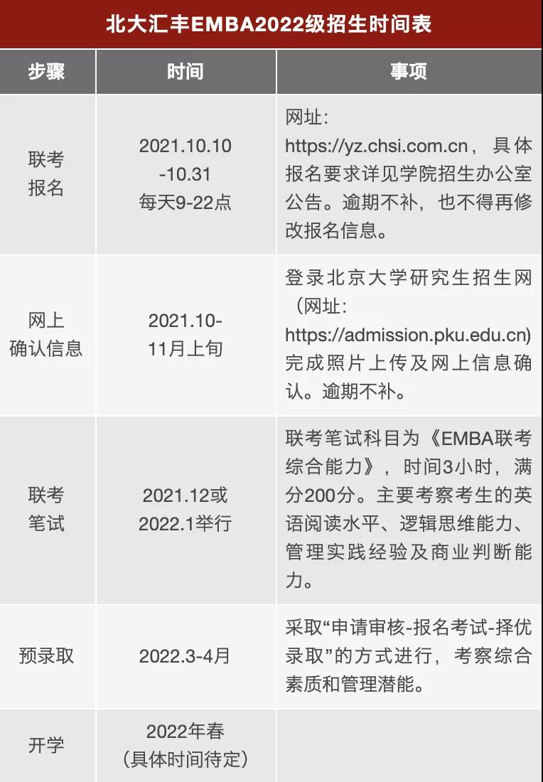 招生簡章是每年考研er需要關注的重要官方政策,一般情況下涵蓋了各個專業的報考條件、招生名額、學費、學制、報考流程等必要信息,為了幫助大家及時掌握一手信息,迅速做出報考應對,小編今天為大家帶來了“2022EMBA招生簡章:北京大學匯豐商學院2022年高級工商管理碩士(EMBA)招生簡章”,希望對報考MBA的同學有所幫助!