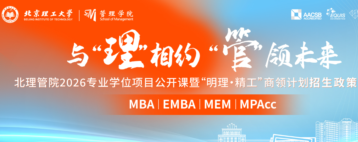 北京理工大學管理學院EMBA項目自2003年開辦至今,秉承“管工融通、引領未來”的辦學使命,將前沿管理理論與企業實踐相結合,培養具有社會責任感、創新精神、數字領導力和科技型戰略決策能力,適應國際競爭的企業家和高階經理人。