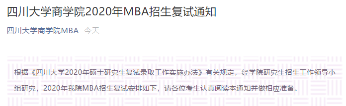 以上就是“2020MBA復(fù)試公告:四川大學(xué)MBA復(fù)試工作安排通知”的全部內(nèi)容,更多考研復(fù)試信息,請多多關(guān)注MBA備考網(wǎng)!祝您考研成功!