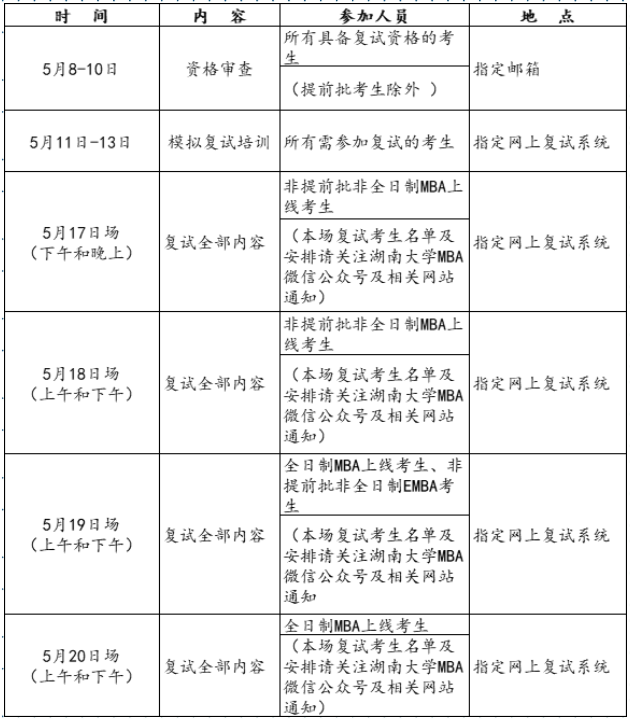 以上就是“2020MBA復試公告:湖南大學MBA復試工作安排通知”的全部內容,更多考研復試信息,請多多關注MBA備考網!祝您考研成功!