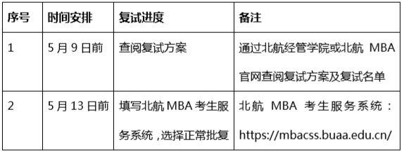 以上就是“2020MBA復試公告:北京航空航天大學MBA復試工作安排通知”的全部內(nèi)容,更多考研復試信息,請多多關注MBA備考網(wǎng)!祝您考研成功!