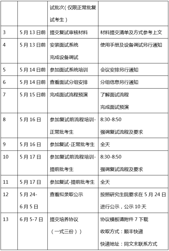復試時間為 2020 年 5 月 16 日呾 5 月 17 日兩天。其中,正常批考生復試時間為2020年5月16日,提前面試獲得A的考生復試時間為2020年5月17日。