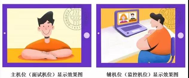 復試前按要求調試好設備,開啟攝像頭,主機位(面試機位)從正面拍攝,對準考生本人,確保考生雙手和頭部完全呈現在拍攝畫面中。輔機位(監控機位)從考生側后方45°拍攝,距離1-2米,確保輔機位能從側后方清晰顯示考生上半身及復試環境,復試專家組能夠從輔機位清晰看到主機位屏幕。屏幕顯示效果圖如下。