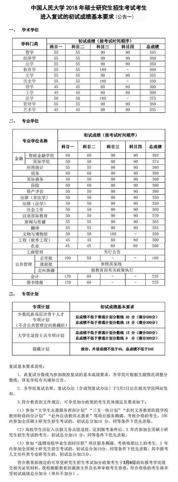 中國人民大學2018年碩士研究生復試分數線現已公布,具體復試分數線情況如下: