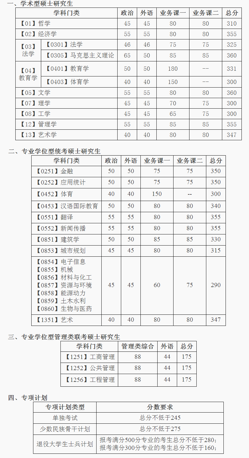 根據(jù)教育部相關(guān)文件精神,結(jié)合我校實(shí)際情況,經(jīng)學(xué)校招生工作領(lǐng)導(dǎo)小組討論研究決定,我校2020年全國(guó)碩士研究生招生考試考生進(jìn)入復(fù)試的初試成績(jī)基本要求如下: