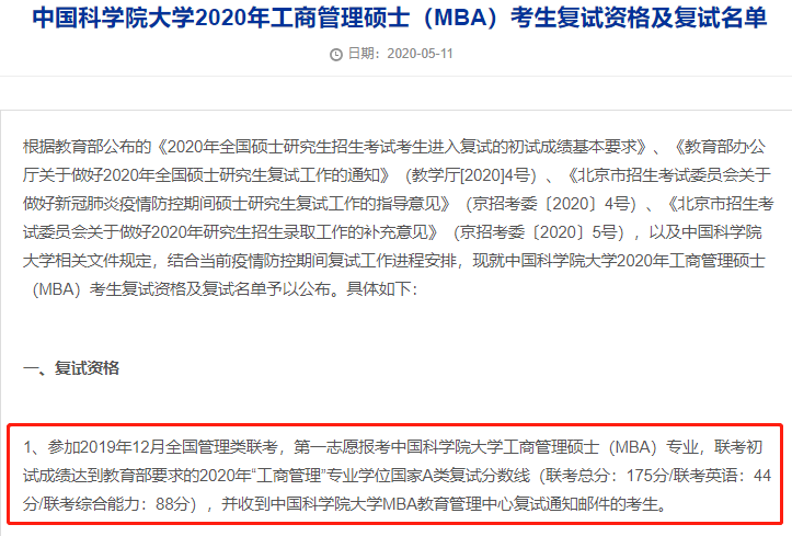 導(dǎo)讀:今天整理了“2020MBA分?jǐn)?shù)線:中國科學(xué)院大學(xué)2020年MBA復(fù)試基本分?jǐn)?shù)線”的內(nèi)容,希望對大家有所幫助!