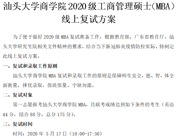 汕頭大學2020年MBA復試基本分數線:175/44/88