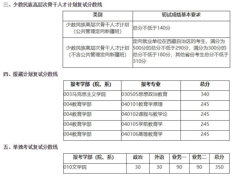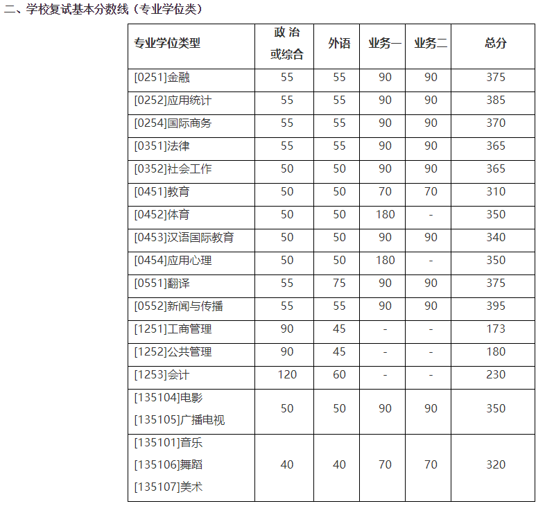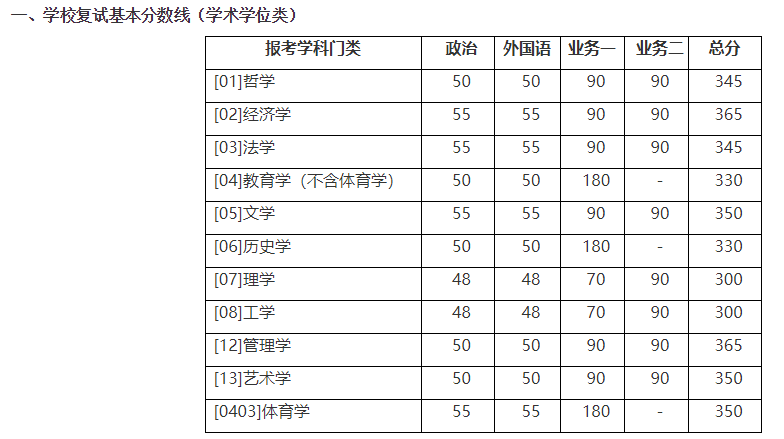 說明:此復(fù)試基本分?jǐn)?shù)線只是我校復(fù)試的最低分?jǐn)?shù)要求,接受報(bào)考的學(xué)部院系可根據(jù)整體考試情況、招生計(jì)劃、學(xué)科專業(yè)特點(diǎn)等,上調(diào)分?jǐn)?shù)要求。考生須同時(shí)達(dá)到學(xué)校復(fù)試基本分?jǐn)?shù)線和報(bào)考學(xué)部院系調(diào)整設(shè)定的復(fù)試分?jǐn)?shù)線,才有資格參加復(fù)試。學(xué)部院系調(diào)整設(shè)定的復(fù)試分?jǐn)?shù)線和復(fù)試辦法,另行通知。