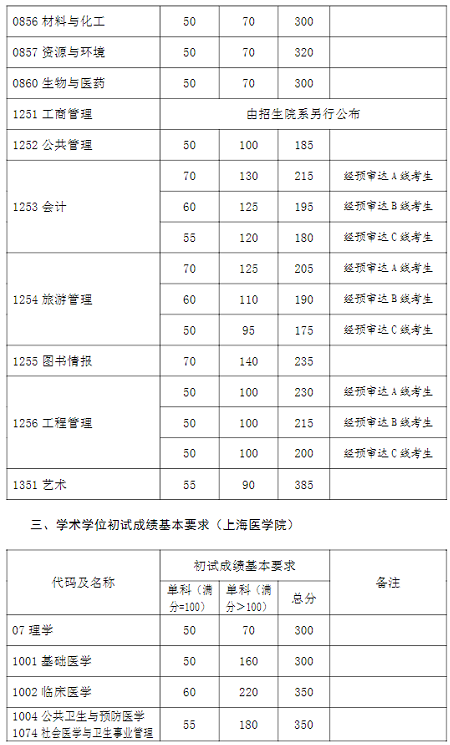 一、學術(shù)學位初試成績基本要求(不含上海醫(yī)學院)
