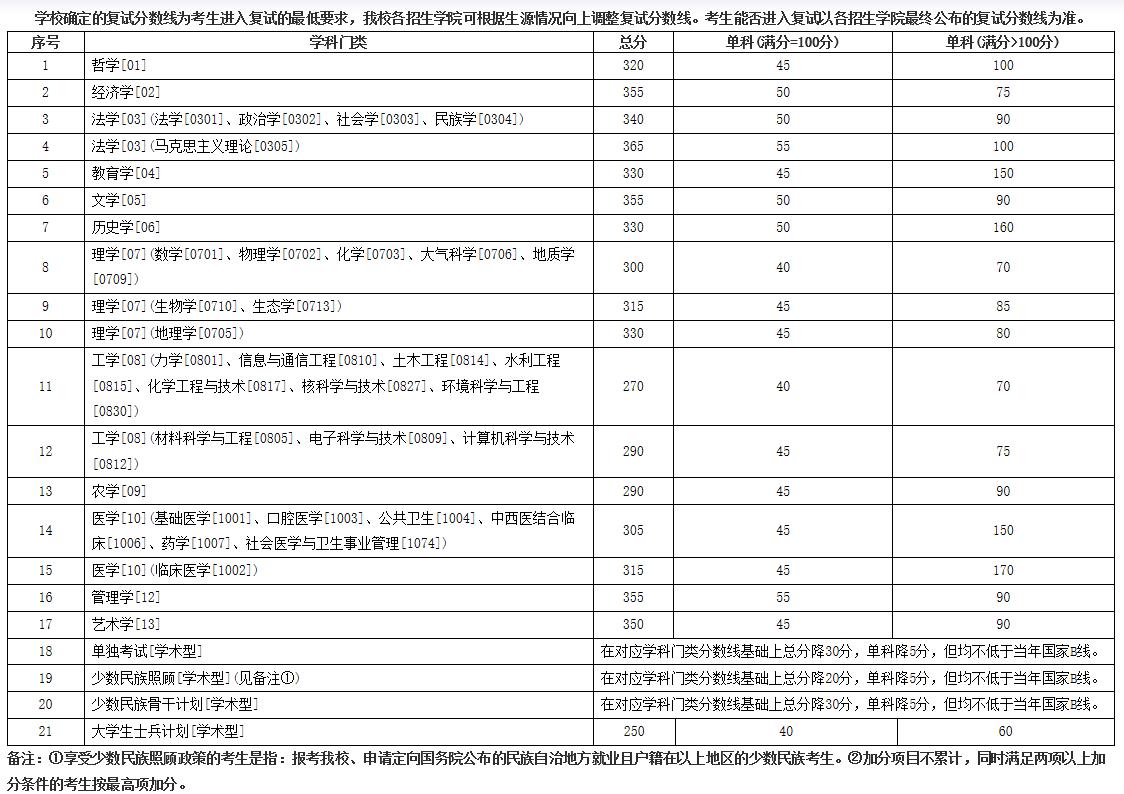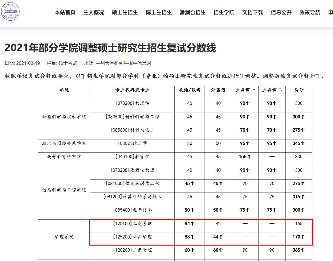 根據(jù)蘭州大學(xué)2021年碩士研究生招生考試復(fù)試分?jǐn)?shù)線的基本要求,管理類聯(lián)考各專業(yè)分?jǐn)?shù)線如下:工商管理[1251]165/84/42、公共管理[1252]170/88/44、會(huì)計(jì)[1253]235/145/70