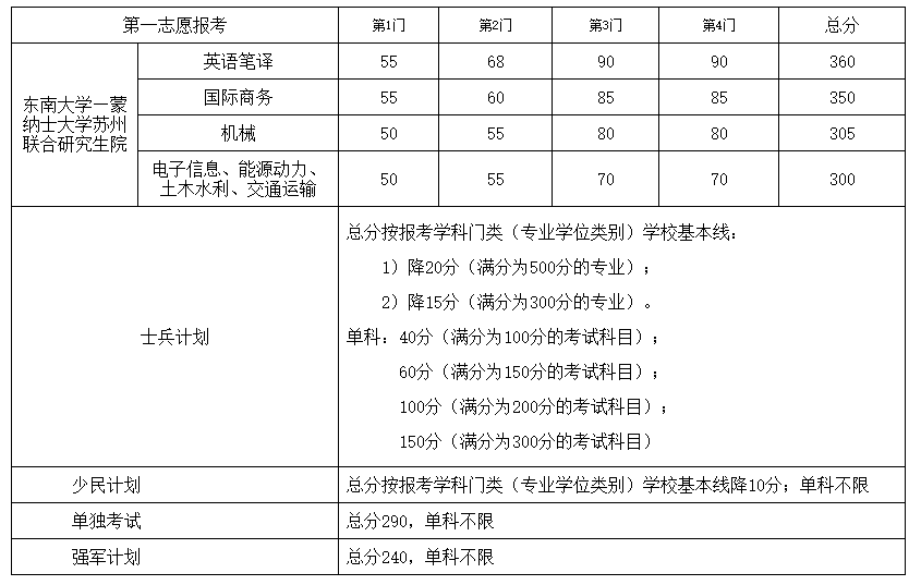 2. 統(tǒng)考考生(不含報考東南大學-蒙納士大學蘇州聯(lián)合研究生院考生和管理類聯(lián)考考生)總分超過報考院(系)專業(yè)復試線20分以上(含20分),單科(限一門)可降2分。