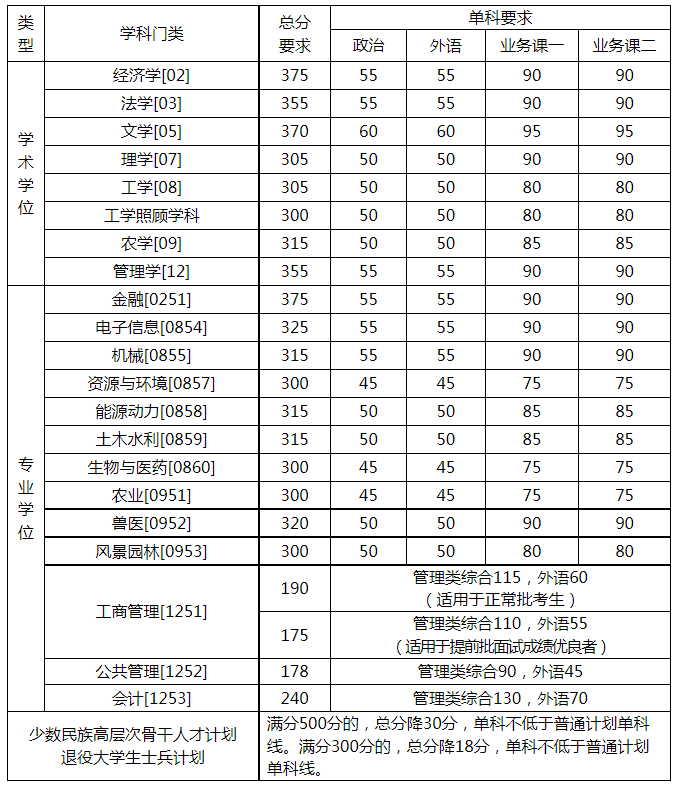 1.上表為我校基本復試分數(shù)要求,生源充裕學院可根據(jù)整體考試情況、招生計劃、學科專業(yè)特點等,上調(diào)分數(shù)要求,但差額復試比例一般不得低于120%。報考該類學院的考生須達到學院公布的復試分數(shù)要求才能參加復試。
