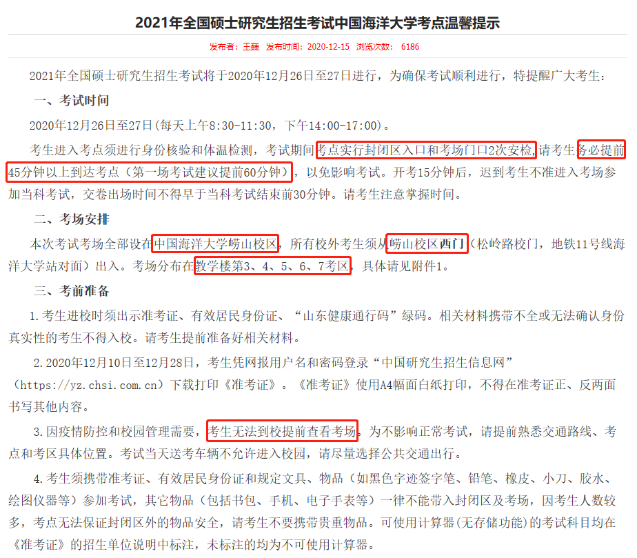 12月15日,中國海洋大學發(fā)布《2021年全國碩士研究生招生考試中國海洋大學考點溫馨提示》。