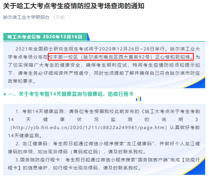 12月16日,哈爾濱工業(yè)大學在其官方微信公眾號上發(fā)布《關于哈工大考點考生疫情防控及考場查詢的通知》。