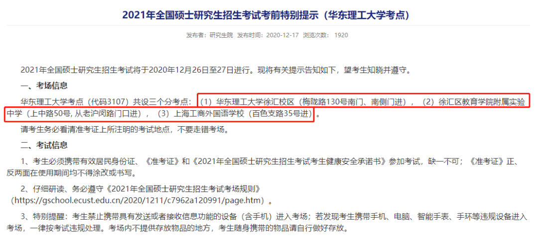 12月17日,華東理工大學發(fā)布《2021年全國碩士研究生招生考試考前特別提示(華東理工大學考點)》。