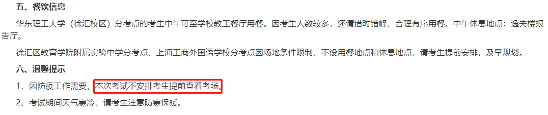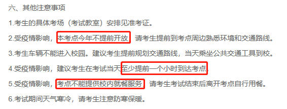 《提醒》顯示:受疫情影響,本考點今年不提前開放,請考生提前到考點周邊熟悉環(huán)境和交通路線;建議考生在考試當天至少提前一個小時到達考點;考點不能提供校內(nèi)就餐服務,請考生考試結(jié)束后離開考點自行用餐。