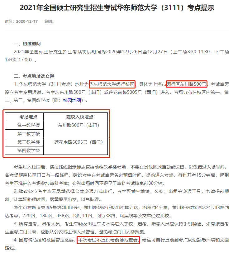 12月17日,華東師范大學發(fā)布《2021年全國碩士研究生招生考試華東師范大學(3111)考點提示》。