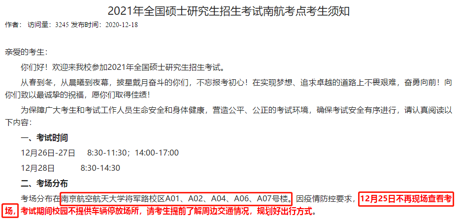 《須知》顯示:考場公布在南京航空航天大學將軍路校區(qū)A01、A02、A04、A06、A07號樓。因疫情防控要求,12月25日不再現(xiàn)場查看考場,考試期間校園不提供車輛停放場所,請考生提前了解周邊交通情況,規(guī)劃好出行方式。