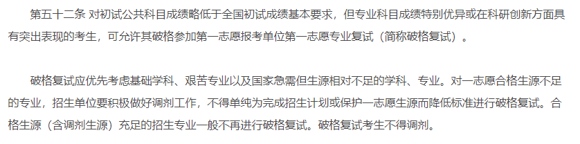 對初試公共科目成績略低于全國初試成績基本要求,但專業(yè)科目成績特別優(yōu)異或在科研創(chuàng)新方面具有突出表現(xiàn)的考生,可允許其破格參加第一志愿報考單位第一志愿專業(yè)復(fù)試(簡稱破格復(fù)試)。