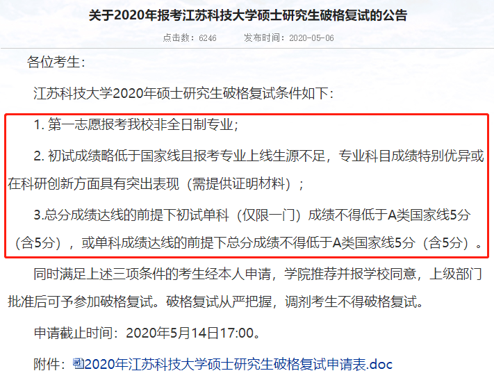 2020年5月6日,江蘇科技大學(xué)研究生院學(xué)科建設(shè)辦公室發(fā)布《關(guān)于2020年報考江蘇科技大學(xué)碩士研究生破格復(fù)試的公告》。