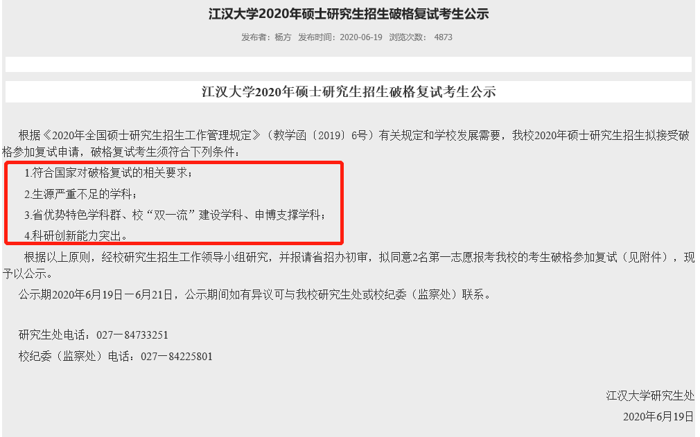 2020年6月19日,江漢大學(xué)研究生處、學(xué)科建設(shè)辦公室發(fā)布《江漢大學(xué)2020年碩士研究生招生破格復(fù)試考生公示》。