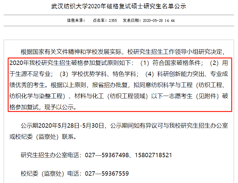 2020年5月28日,武漢紡織大學(xué)研究生處發(fā)布《武漢紡織大學(xué)2020年破格復(fù)試碩士研究生名單公示》。