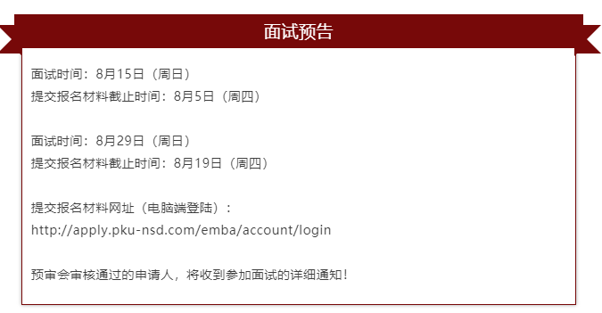 申請人完整填寫北大國發院EMBA申請資料后,由國發院招生專家組對申請資料進行審查,通過審查者獲得面試資格。