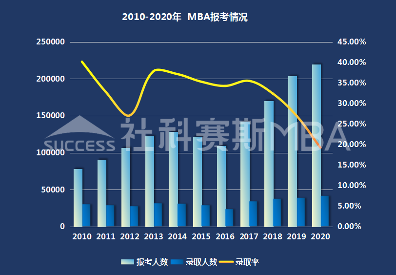 就讀MBA對于一個人的綜合能力、薪資水平、職業發展空間等各方面的提升都是肉眼可見的,認可MBA的人群也在迅速增加。從近十年的報考數據中也可以看出,隨著越來越多人選擇報考MBA,錄取難度也越來越大。