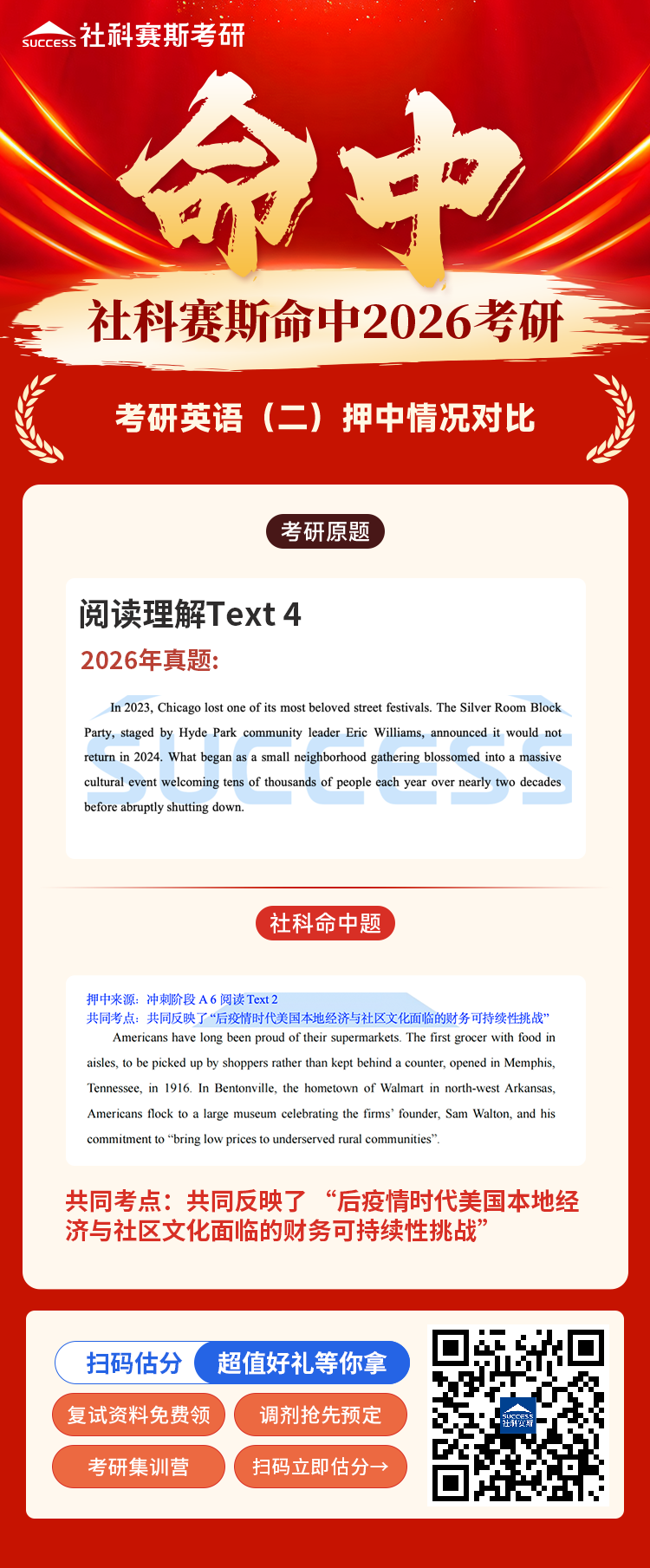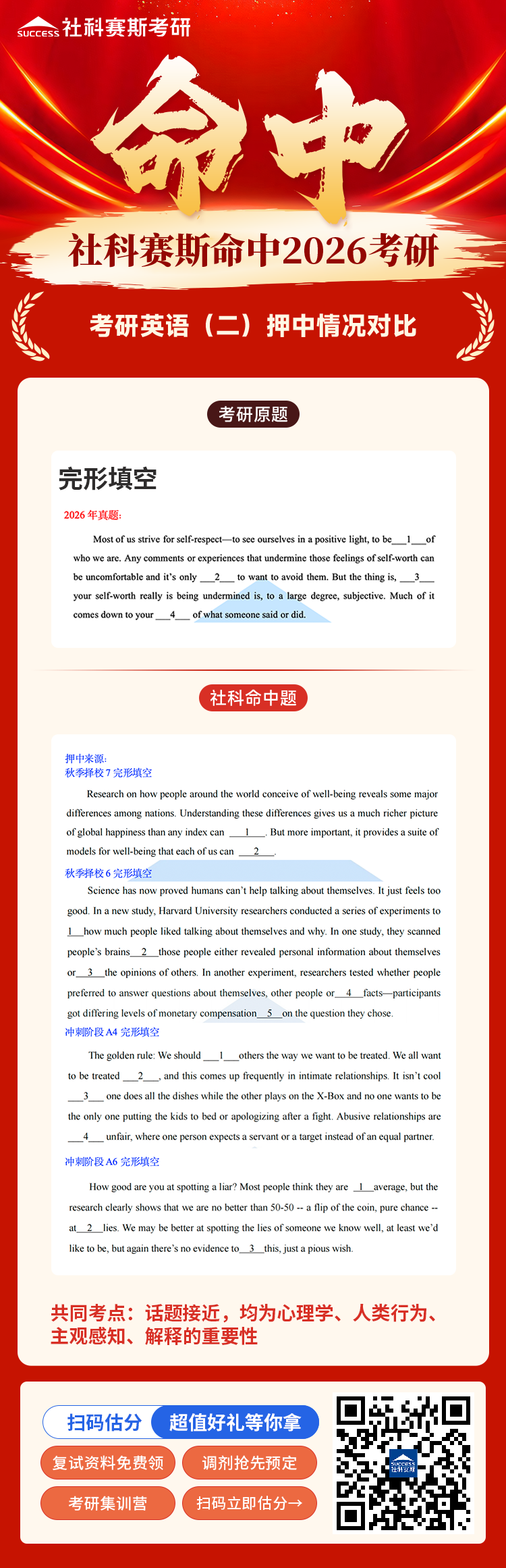 喜報:社科賽斯考研再次命中2026考研(英語二)完型與閱讀理解真題!