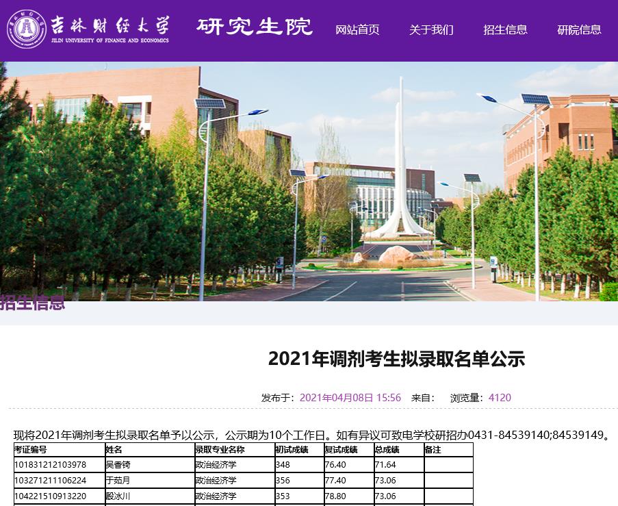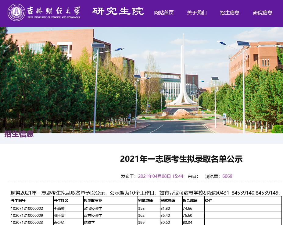 導(dǎo)讀:近日,已有院校公布2021研究生擬錄取名單。考研的同學(xué)們有沒有關(guān)注?今天小編就整理了“2021考研擬錄取名單:吉林財經(jīng)大學(xué)2021年碩士研究生招生擬錄取名單”的相關(guān)內(nèi)容,希望能對大家有所幫助。