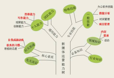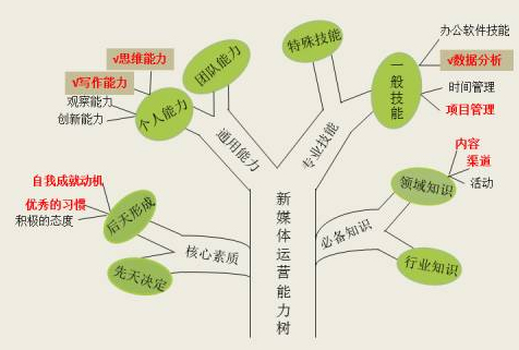 我們已經(jīng)知道,參考管理咨詢顧問這一相當(dāng)萬金油的行業(yè),80%的能力樹樹干上可以分出4個枝杈:核心素質(zhì)、通用能力、專業(yè)技能和各類知識。下圖是YouCore某位“新媒體運(yùn)營”崗位的同事在這四大分類下識別出的自己的優(yōu)勢能力,也即紅葉子。