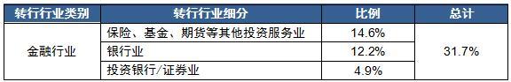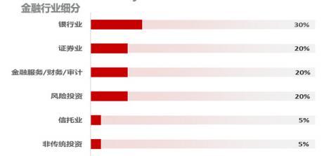 2016年中央財經(jīng)大學(xué)的MBA就業(yè)報告里,由非金融行業(yè)轉(zhuǎn)換到金融行業(yè)的比率高達31.7%;金融行業(yè)之間的轉(zhuǎn)換比率為17.1%;其中非金融行業(yè)轉(zhuǎn)換到金融行業(yè)的具體細(xì)分情況如下: