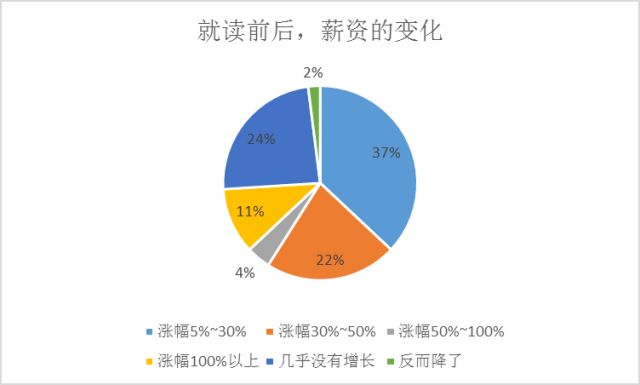 如圖,所有被調(diào)查人群中,有37%的人在攻讀MBA后薪酬漲幅在5%——30%之間,22%的人薪酬漲幅在30%——50%之間,同時(shí)也有一定比例的人認(rèn)為攻讀MBA后薪酬幾乎沒(méi)有增長(zhǎng),這部分人數(shù)占比達(dá)24%。