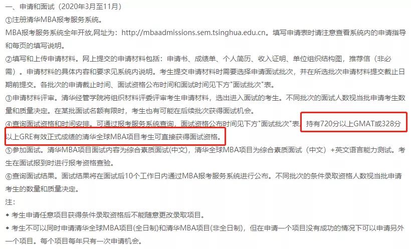 持有720分以上GMAT或328分以上GRE有效正式成績的清華全球MBA項目考生可直接獲得面試資格。