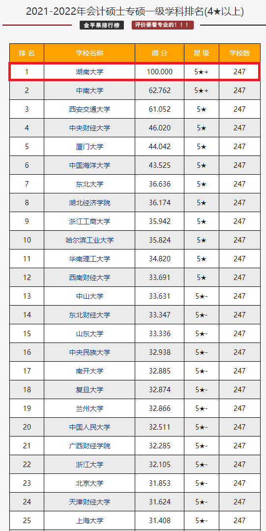 2021-2022年會計碩士學科(專碩)研究生教育排行榜公布,湖南大學會計專業碩士再次奪得榜首!湖南大學MPAcc已連續四年在該排行榜中名列前茅。2021年會計碩士學科(專碩)研究生教育排行榜中,排行前三名的分別是湖南大學、中南大學和西安交通大學,一共有247個會計專碩培養單位參加了此次評選。