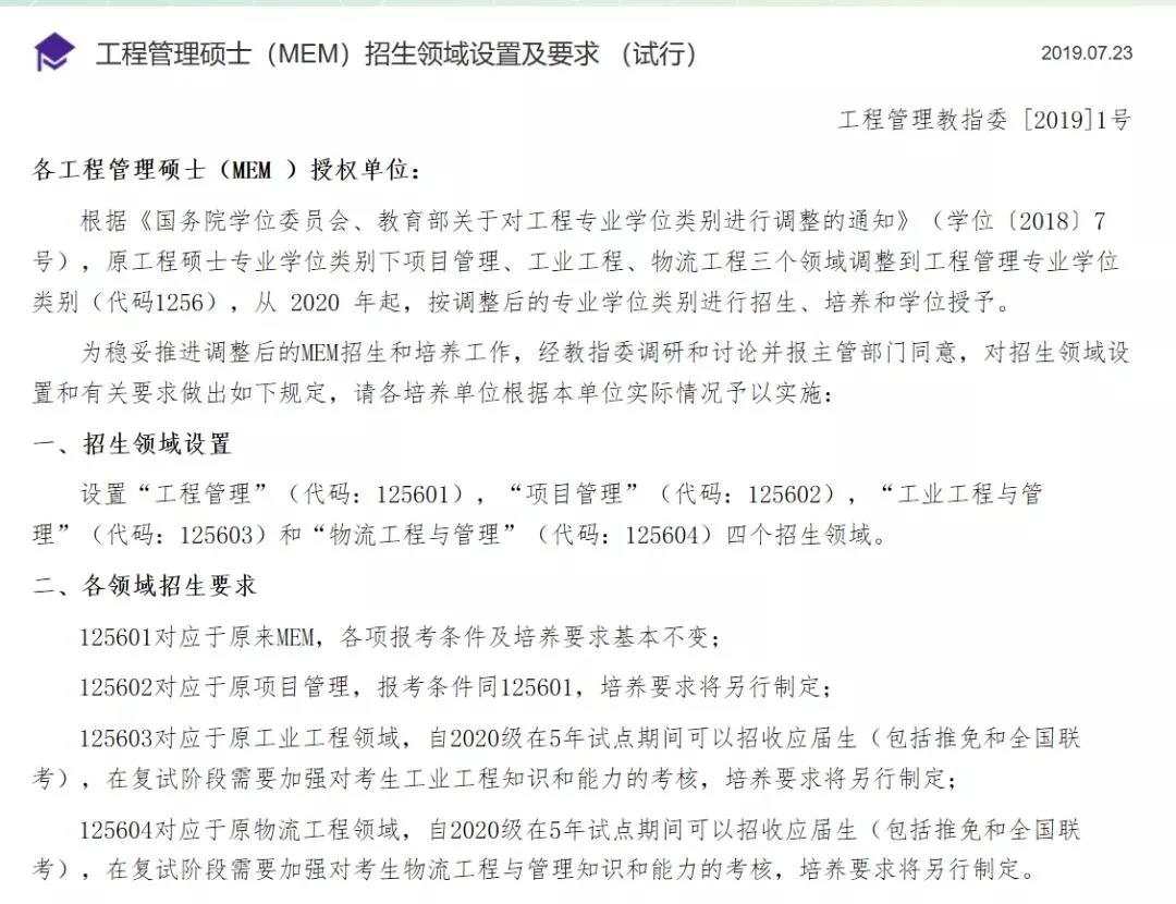 2019年7月23日經全國工程管理專業學位研究生教育指導委員會調整,原工程碩士專業學位類別下項目管理、工業工程、物流工程三個領域調整到工程管理專業學位類別(代碼1256),從 2020 年起,按調整后的專業學位類別進行招生、培養和學位授予。
