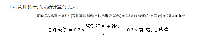 工程管理專業考生總評成績=初試成績(外語+管理類綜合)÷3×0.7+復試成績×0.3。