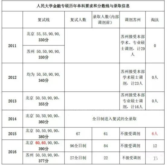 (3)對復試線的解讀:自2011年以來,各大名校金碩復試線考生熱情很高,人大金碩復試線從340竄到360到2015的380到2016的390,不過每年的復試分數線是跟大家的考試成績是相關聯的,2017年北京的分數線是381,蘇州的分數線與2016年持平377;但2015年的中財金院是個例外,當年復試線340,原因是整體成績都不佳,所以不要全部按照歷年的分數來判斷下一年的分數線。人大金專難考性是相對的。然而對比清華的406分和北大的390+的復試線,再相比同等360+復試線的中財和貿大,人大優質的教育資源又是他們不可比擬的。所以有志于2018年人大金碩的同學務必相信自己的選擇,抓緊時間復習,努力使自己的最后排名能往前一點。