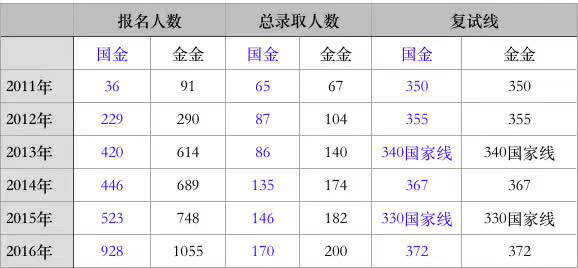 每年都有很多同學想要了解國金和金金哪個難,這個問題真的沒法給出具體的答復,因為“難”這個字很難定義,下面給出兩個學院2011-2016年的報錄比和復試線,大家自己對比一下,因為2017年沒有官方數據,這里就沒有列出。