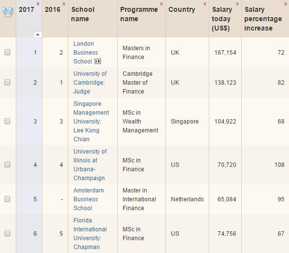 第一名是倫敦商學院,第二名是劍橋大學Judge學院,第三名是新加坡管理大學Lee Kong Chian商學院。第四到第六名分別是:伊利諾伊大學香檳分校、阿姆斯特丹商學院以及佛羅里達國際大學。
