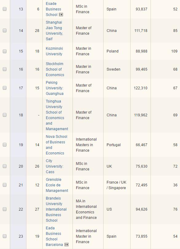 上海交通大學上海高級金融學院(第14名)、北京大學光華管理學院(第17名)、清華大學經(jīng)濟管理學院(第18名)、新加坡管理大學李光前商學院(第44名)、.香港中文大學商學院(第53名)、中山大學嶺南學院(第56名)。對的,你沒有看錯,上海高級金融學院排名最高,排在清華北大前面!