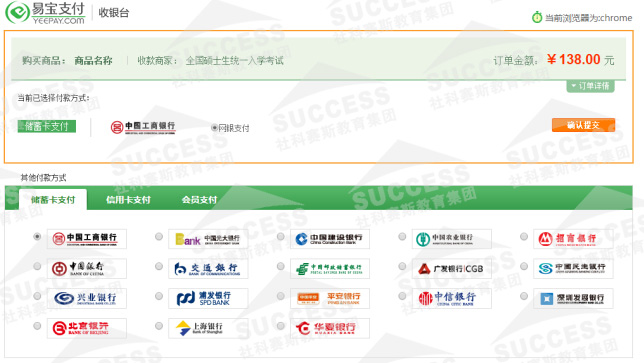 若此報(bào)考點(diǎn)開通了網(wǎng)上支付,您必須選擇網(wǎng)上交費(fèi)來完成碩士研究生報(bào)名,否則此次報(bào)名數(shù)據(jù)無效!(如果您在本次交費(fèi)過程中交易處理失敗,您可以在網(wǎng)上報(bào)名期間隨時(shí)登錄網(wǎng)上報(bào)名系統(tǒng)進(jìn)行網(wǎng)上支付)